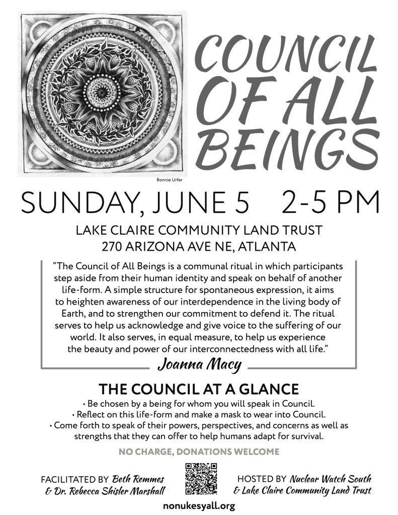 Nuclear Watch South and Green Friends at Atlanta Friends Meeting, have joined together to sponsor a full-day workshop on Saturday, June 4th. We are also holding a Council of All Beings at the Lake Clair Community Land Trust on Sunday, June 5th. Both events are free and open to the public, although it would help us if you could register here so we have an idea of how many people to expect.
